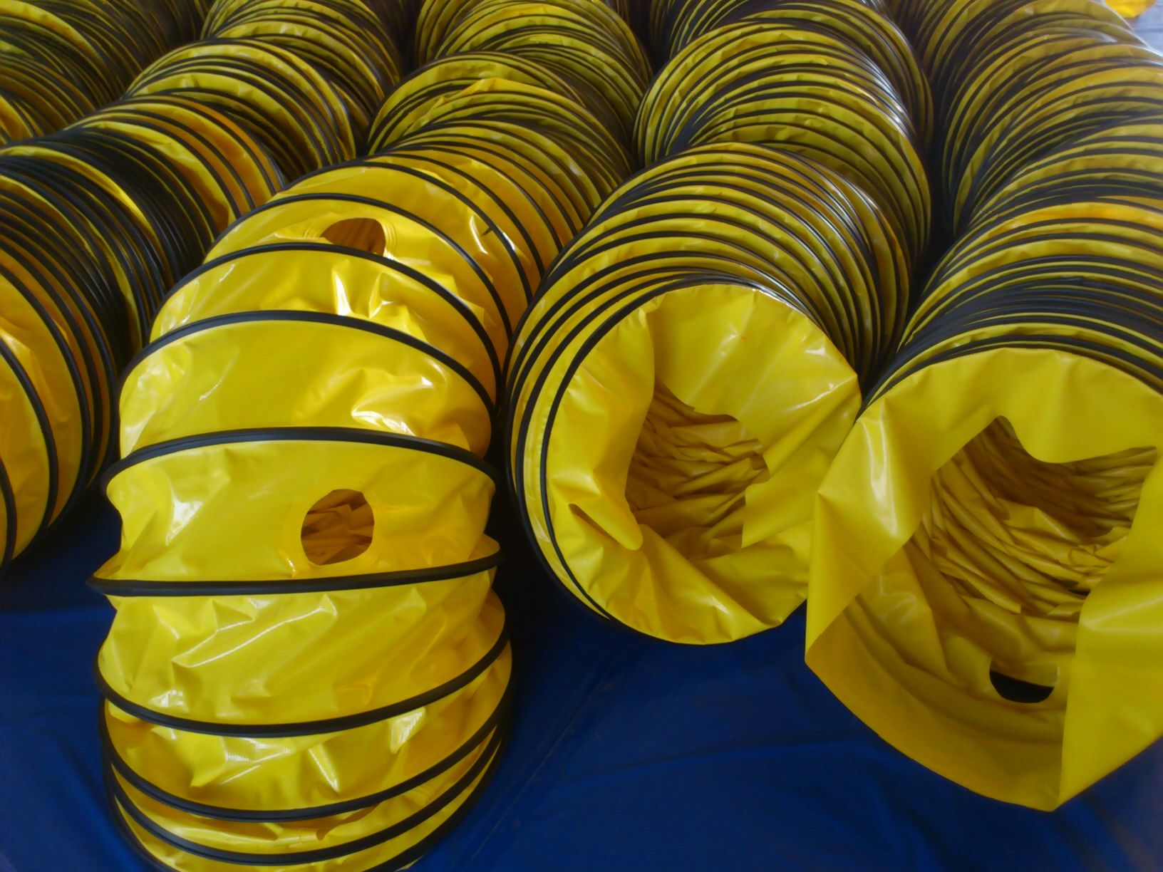 風(fēng)管主要由三種材料組成,鋼線, 阻燃的PVC夾網(wǎng)布, PVC膠條。 用PVC膠條包裹著的鋼線作為風(fēng)管的骨架,風(fēng)管的管身是PVC夾網(wǎng)布,管身處每隔一米有一個金屬吊環(huán),用于固定風(fēng)管。