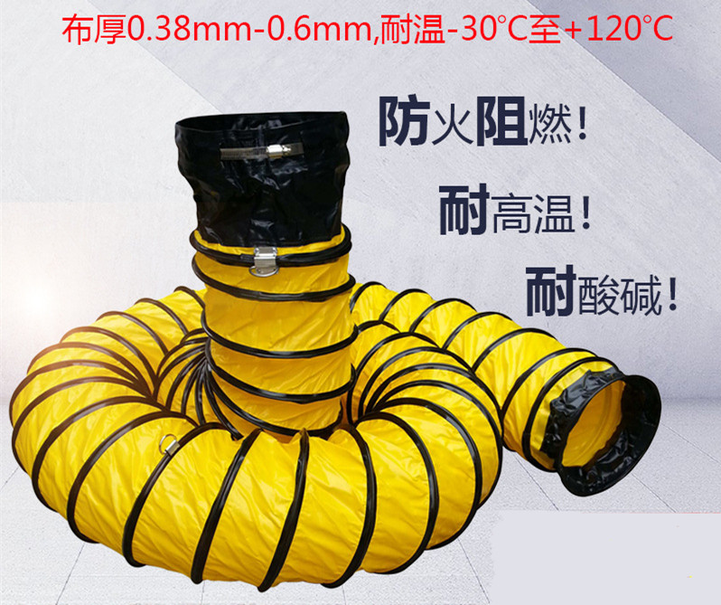 風(fēng)管主要由三種材料組成,鋼線, 阻燃的PVC夾網(wǎng)布, PVC膠條。 用PVC膠條包裹著的鋼線作為風(fēng)管的骨架,風(fēng)管的管身是PVC夾網(wǎng)布,管身處每隔一米有一個金屬吊環(huán),用于固定風(fēng)管。