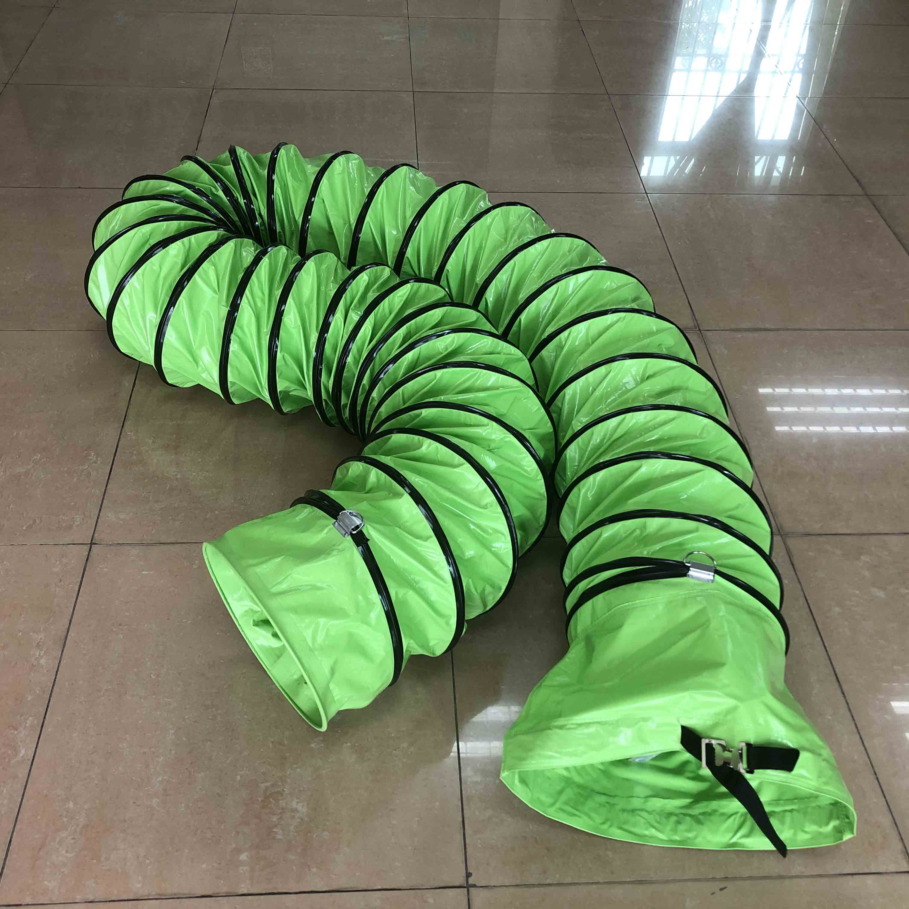 風(fēng)管主要由三種材料組成,鋼線, 阻燃的PVC夾網(wǎng)布, PVC膠條。 用PVC膠條包裹著的鋼線作為風(fēng)管的骨架,風(fēng)管的管身是PVC夾網(wǎng)布,管身處每隔一米有一個(gè)金屬吊環(huán),用于固定風(fēng)管。